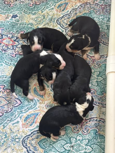 Angel is doing an amazing job caring for her beautiful litter of tri-colored Bernedoodle puppies. While the day did not go exactly as planned, we are so thankful that Angel and her precious puppies are doing wonderfully well. Their sweet beginning is already filling hearts with joy.